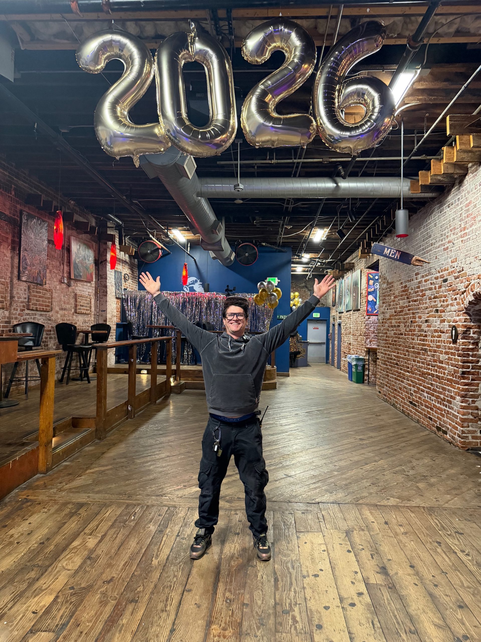 Nick greeting the year at Cervantes where he is the Lighting Director